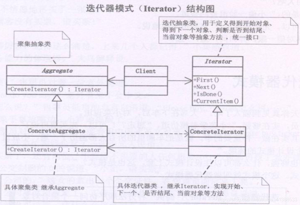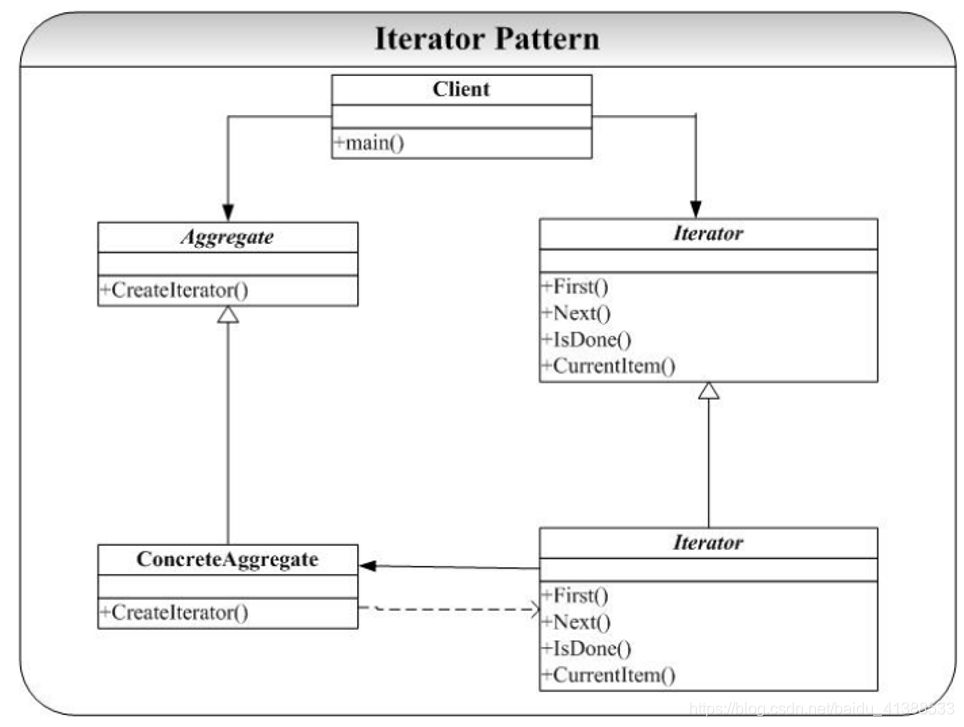 includeusing namespace std;typedef int Object ;#define SIZE 5 //注意类的顺序 class MyIterator{public: virtual void First() = 0; virtual void Next() = 0; virtual bool IsDone() = 0; virtual Object CurrentItem() = 0;};class Aggregate{public: virtual Object getItem(int index) = 0; virtual MyIterator *CreateIterator() = 0; virtual int getSize() = 0;};class ContreteIterator : public MyIterator{public: ContreteIterator(Aggregate *ag) { _ag = ag; _idx = 0; } ~ContreteIterator() { _ag = NULL; _idx = 0; } virtual void First() { _idx = 0; } virtual void Next() { if (_idx < _ag->getSize()) { _idx ++; } } virtual bool IsDone() { return (_idx == _ag->getSize()); } virtual Object CurrentItem() { return _ag->getItem(_idx); }protected:private: int _idx; Aggregate *_ag;};class ConcreteAggregate : public Aggregate{public: ConcreteAggregate() { for (int i=0; i CreateIterator(); //通过迭代器 遍历 集合 for (; !(it->IsDone()); it->Next() ) { cout << it->CurrentItem() << " "; } //清理相关资源 delete it; delete ag;}void main(){ main21(); system("pause"); return ;}